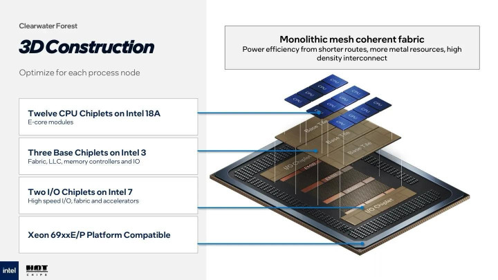 要搞懂这颗芯片的分量,得先看制程和封装的突破。Intel 18A是英特尔首款用上RibbonFET全环绕栅极晶体管和PowerVia背面供电的量产制程,晶体管密度比上一代高30%,能效还优化了15%;再配上Foveros Direct 3D封装,用10微米级铜柱直连把12个18A芯粒、3个Intel 3基础芯片和2颗Intel 7 I/O芯粒“粘”在一起,不仅288个核心不打架,核心间通信延迟还降了40%,这种“芯片搭积木”的思路,让它能灵活适配云计算、AI推理等不同场景。