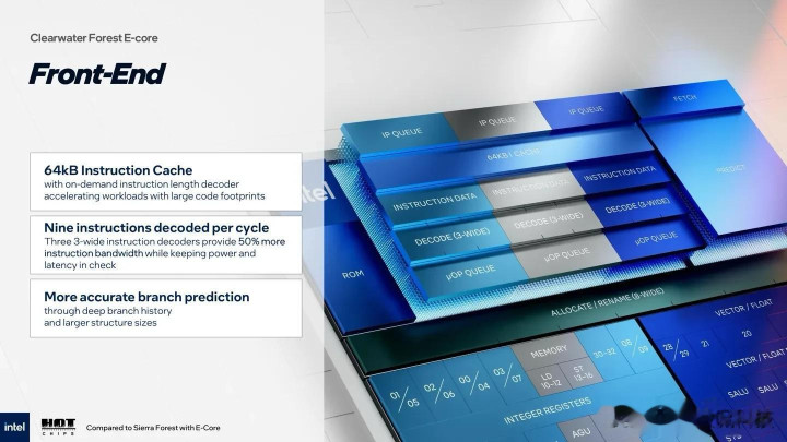 性能提升也不是空谈,相较上一代“Sierra Forest”,它的IPC(每时钟周期指令数)涨了17%,背后藏着不少硬改动:解码前端从之前的2×2改成3×3,一次能处理3条指令,吞吐量直接提50%;分支预测器加了机器学习算法,误判率少了22%;乱序执行引擎的执行单元从16个加到24个,浮点运算能力强了30%。有业内测试数据显示,在云计算常见的虚拟化任务里,它的单线程性能快追上AMD EPYC 96核机型,多线程效率还比竞品高18%。